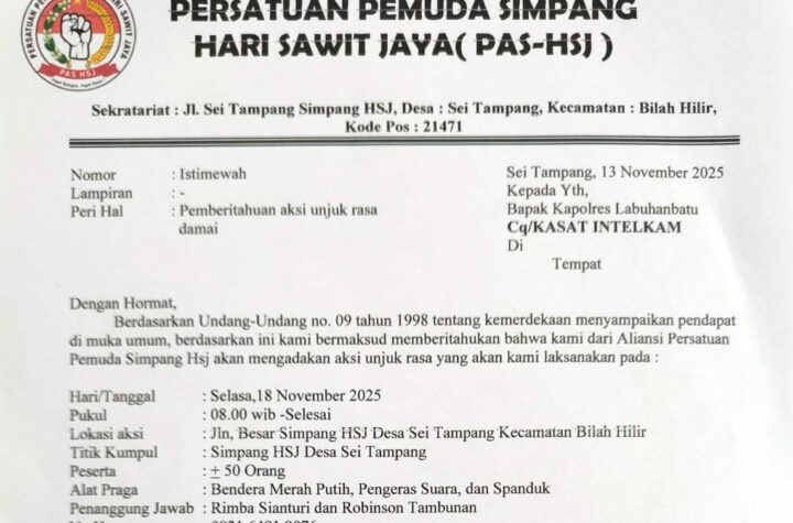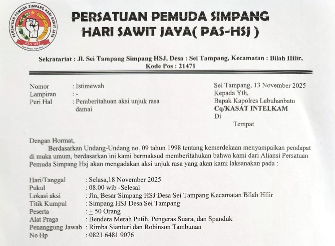 SuaraINetizen.Com - Labuhanbatu, Berdasarkan informasi dan surat pemberitahuan aksi unjuk rasa damai yang dilayangkan pada 13 November 2025, Persatuan Pemuda...