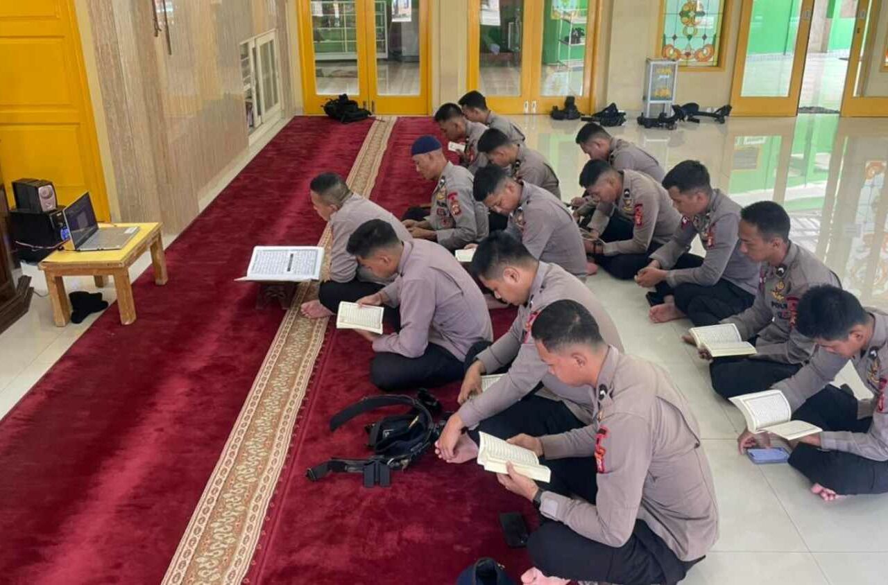 Jakarta - Personel Batalyon A Pelopor Satbrimob Polda Metro Jaya menghidupkan suasana Ramadan melalui tadarus Al-Qur’an di Masjid At-Taubah Mako...