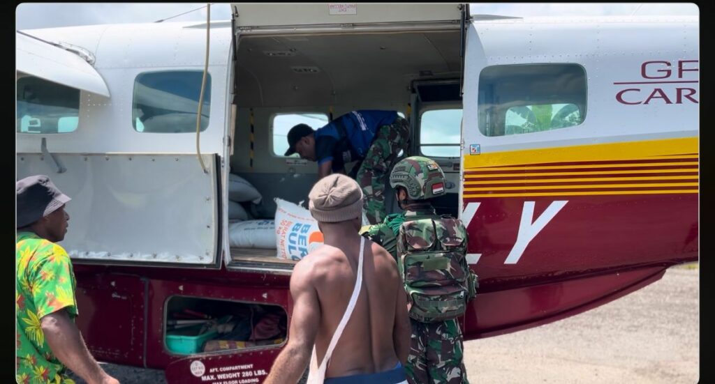 Logistik tersebut diangkut menggunakan pesawat dan diturunkan langsung di wilayah Iwur. Prajurit TNI dari Pos Iwur sigap membantu proses bongkar muat dari pesawat guna memastikan distribusi berjalan lancar dan aman hingga ke tangan masyarakat.