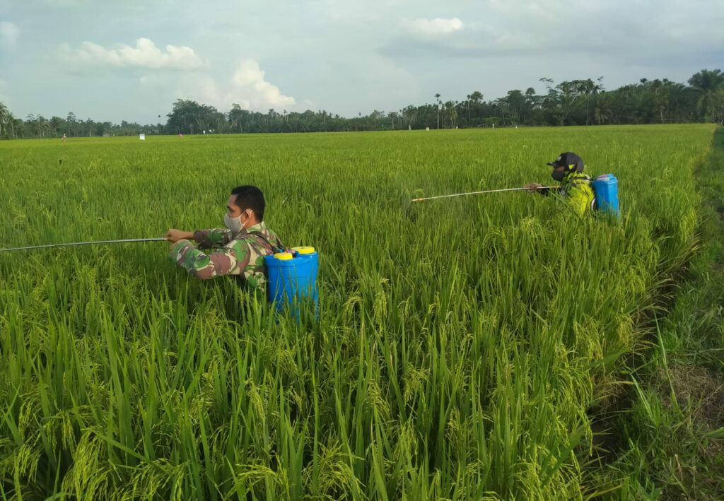 Babinsa dan Petani Kompak Lakukan Penyemprotan Hama Padi