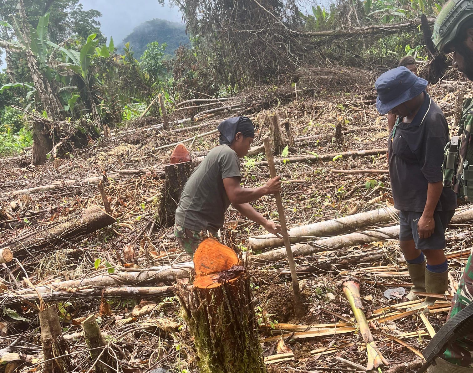 SuaraINetizen.Com – Kampung Beringin, Pegunungan Bintang, Personel Pos Selal Satgas Pamtas RI–PNG Yonif 751/Vira Jaya Sakti (VJS) melaksanakan penanaman pohon pisang bersama warga Kampung Beringin pada (Selasa,30/9/2025). Kegiatan gotong royong ini melibatkan tokoh masyarakat setempat, Bapak Naum, serta Kepala Kampung Beringin, Bapak Ignasius Jamki.