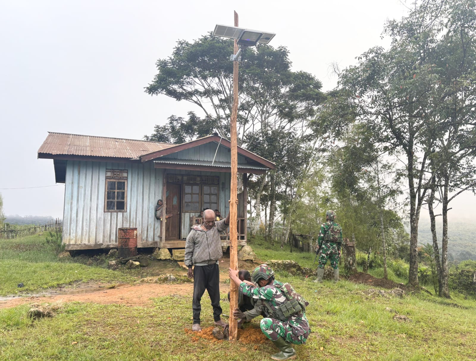 SuaraINetizen.Com – Serambakon, Papua Pegunungan, Tentara Nasional Indonesia (TNI) melalui Pos Serambakon memasang lampu solar cell di Kampung Seramkatop, Distrik Serambakon, sebagai wujud kepedulian terhadap masyarakat pedalaman yang selama ini terbatas akses penerangan. Kegiatan dipimpin langsung Danpos Serambakon Letda Inf Ilham Putra (Minggu,5/10/2025).