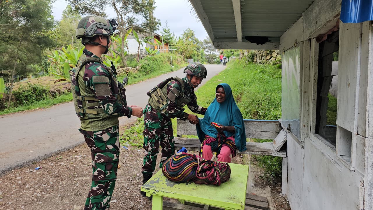 “Ketika interaksi berlangsung, para Prajurit menyapa, berbagi kasih dengan menyerahkan bantuan berupa bibit berbagai macam tanaman sayuran kepada Mama-mama yang membutuhkan dan bagikan makanan ringan kepada anak-anak Papua yang membuat mereka ceria dan bahagia.