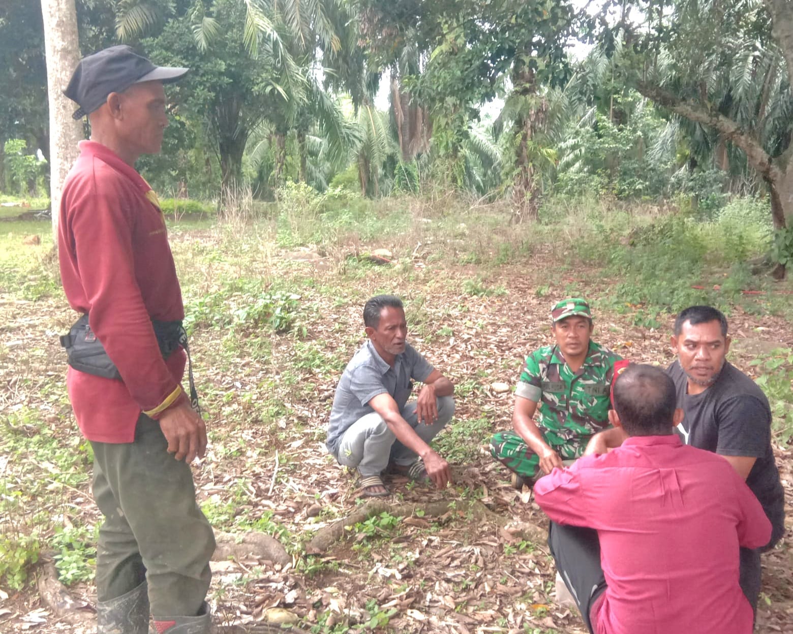 Dalam kegiatan tersebut, Serda Saiful Huda tampak berinteraksi langsung dengan beberapa warga di sebuah area perkebunan. Suasana santai terlihat ketika Babinsa duduk bersama masyarakat sambil berdiskusi mengenai kondisi keamanan dan perkembangan situasi di desa. Masyarakat menyambut hangat kehadiran Babinsa dan ikut menyampaikan berbagai informasi terkait lingkungan sekitar.
