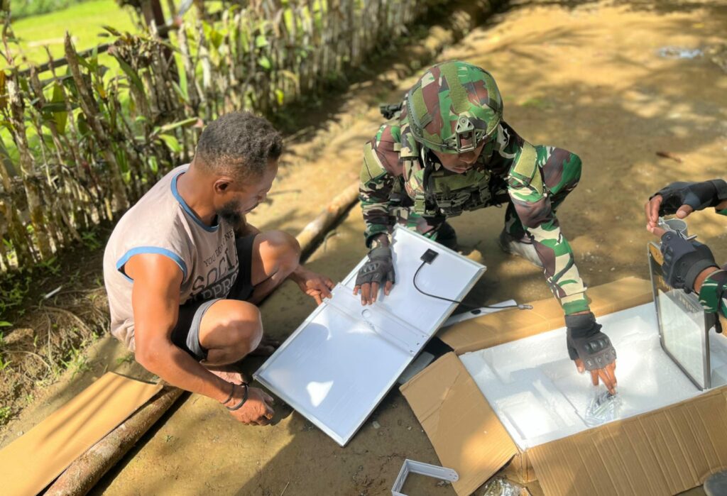 Ket :Pos Iwur Satgas Yonif 751/VJS Pasang Lampu Tenaga Surya di Kampung Serumkubin