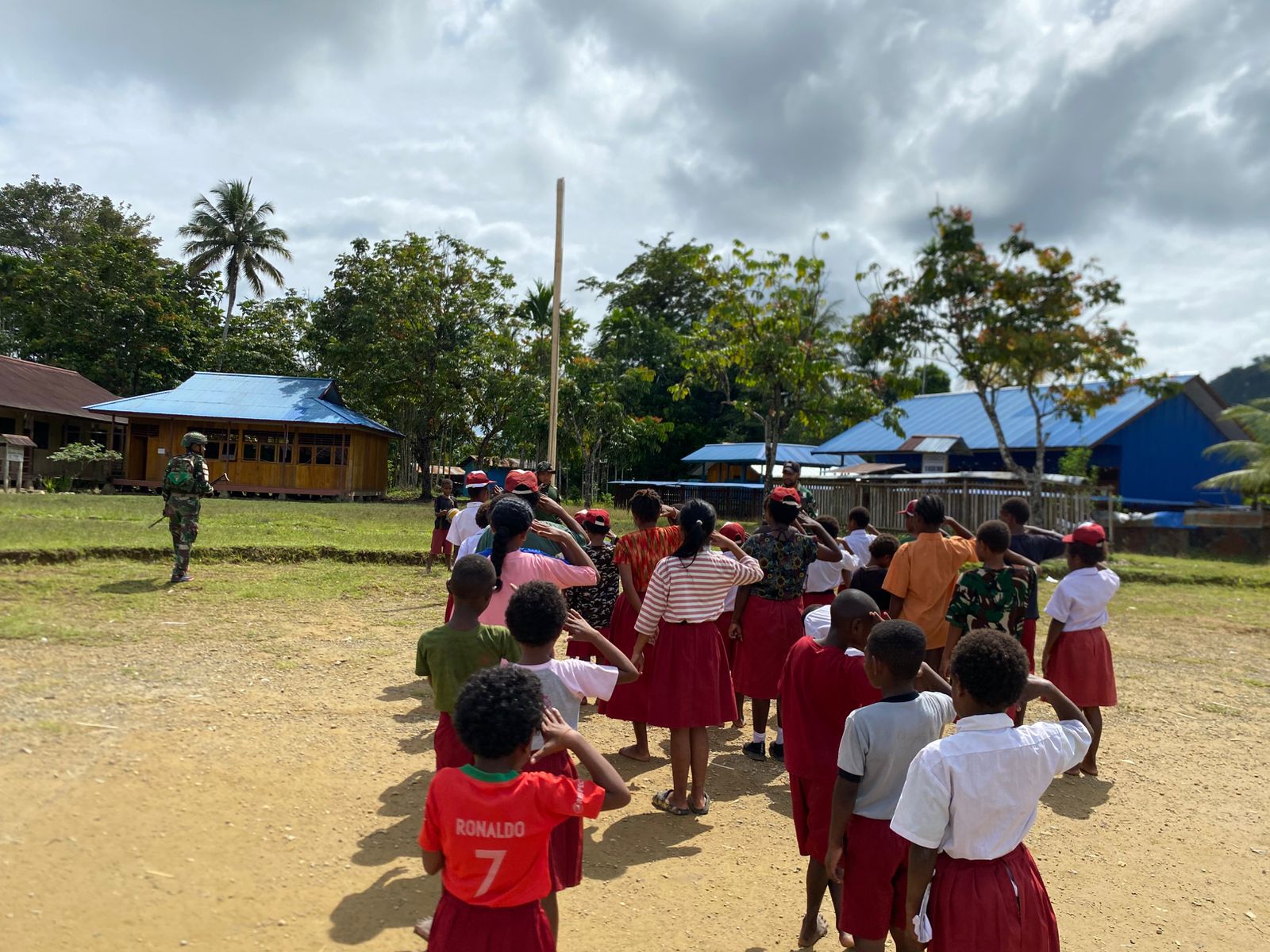 SuaraINetizen.ComIwur, Pegunungan Bintang – Pos Iwur Satgas Pamtas RI–PNG Yonif 751/Vira Jaya Sakti (VJS) menyelenggarakan kegiatan komunikasi sosial (Komsos) di SD Inpres Iwur dengan muatan materi lagu-lagu nasional dan Peraturan Baris-Berbaris (PBB). Kegiatan dipimpin Danpos Iwur, Lettu Inf Afrizal Sianipar, sebagai upaya menumbuhkan disiplin, kebersamaan, dan rasa cinta tanah air sejak dini di lingkungan sekolah.(Senin,1/12/2025).