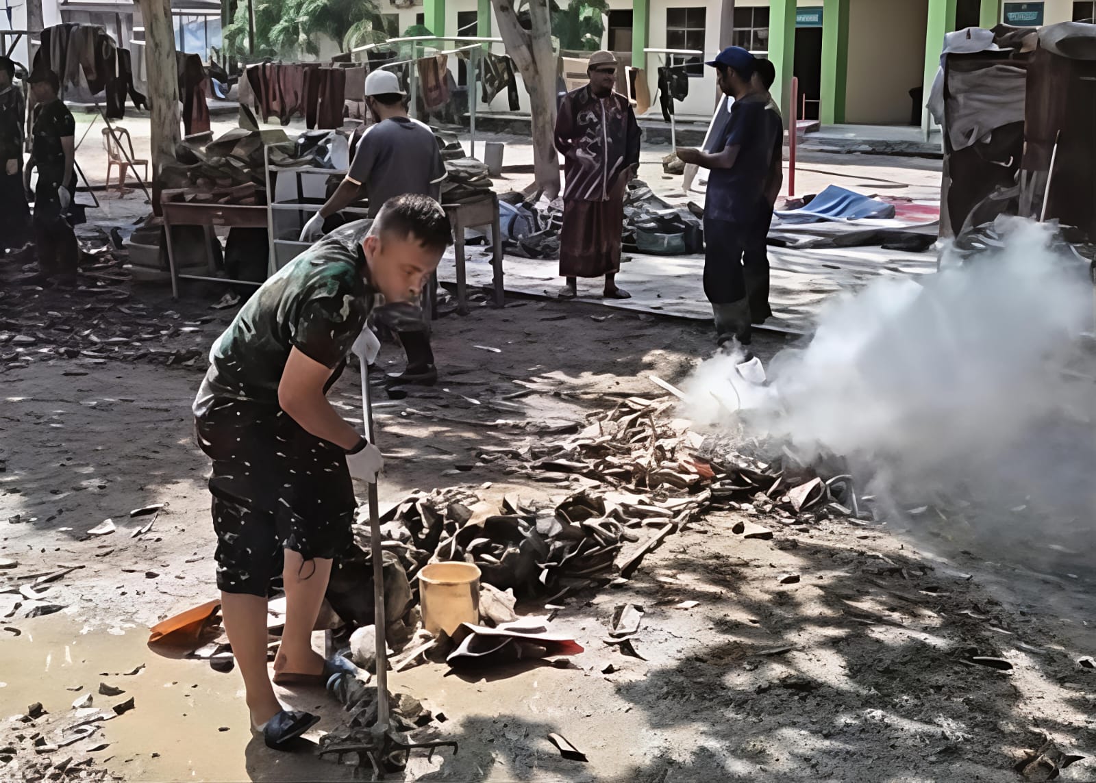 Sedikit demi sedikit, lumpur sisa banjir berhasil dibersihkan melalui kerja keras dan sinergi seluruh elemen yang terlibat, menjadi cerminan kekompakan serta kemanunggalan TNI dengan rakyat dalam memulihkan lingkungan Dayah Samsul Duha pascabanjir.