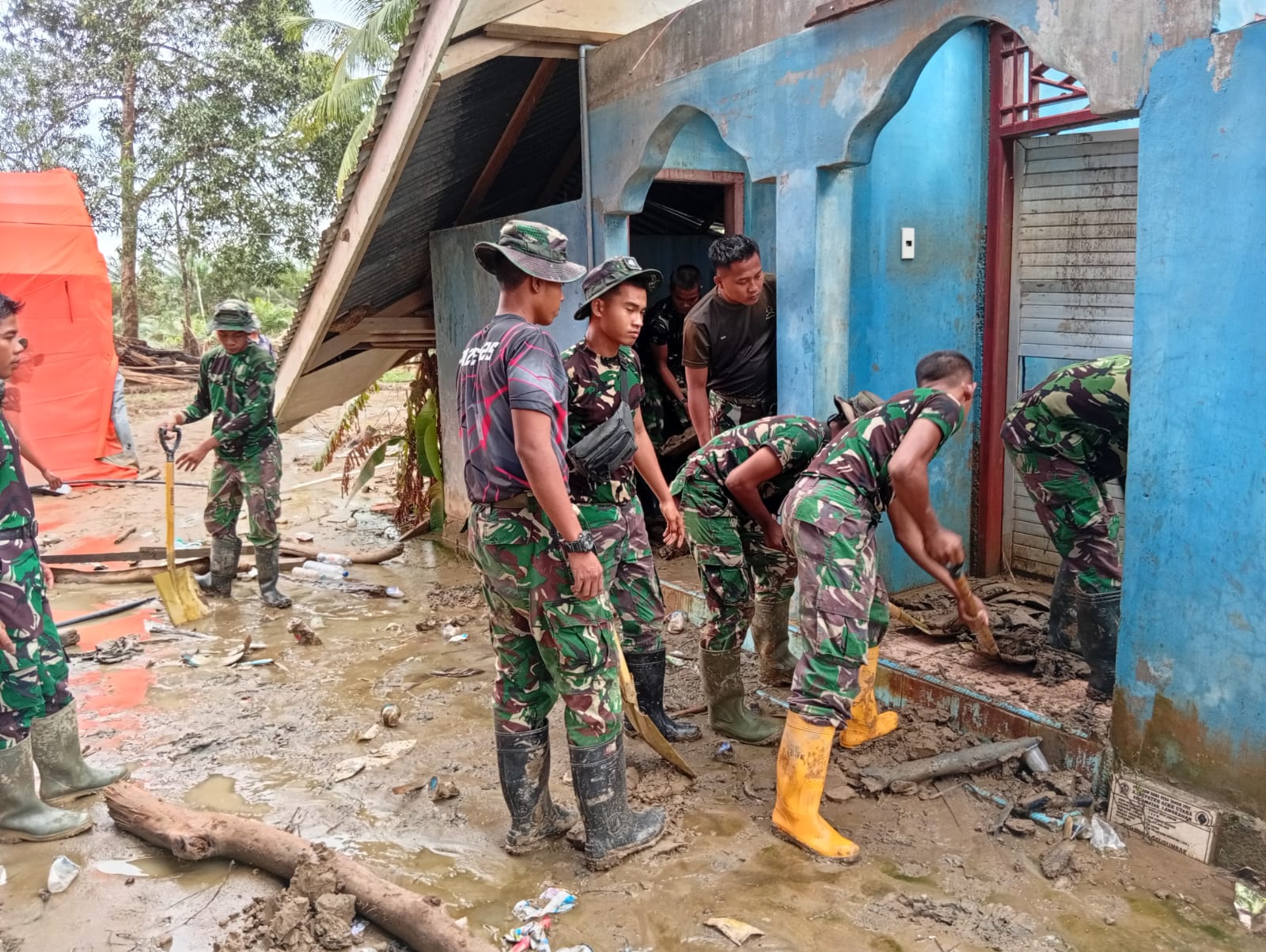 Di sela-sela pembersihan, Letda Sugeng yang didampingi Letda Irfan serta Babinsa pendamping Kopda Rizal, menegaskan bahwa TNI berkomitmen penuh untuk membantu masyarakat pulih dari dampak bencana. “Kami melaksanakan aksi Karya Bhakti ini dengan sasaran utama pembersihan kamar mandi dan tempat wudhu agar akses fasilitas umum segera pulih.