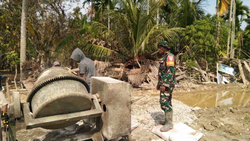 SuaraINetizen.Com – Aceh Utara, Debu jalanan dan terik matahari di Desa Bantayan tidak menyurutkan semangat Sertu Hayuti, Babinsa Koramil 29/Langkahan, untuk terus berada di tengah-tengah warganya. Sambil memperhatikan aliran semen yang keluar dari mesin molen, ia tampak sesekali berdiskusi dengan para pekerja dari CV 08 Konstruksi. Sabtu (24/1/2026).