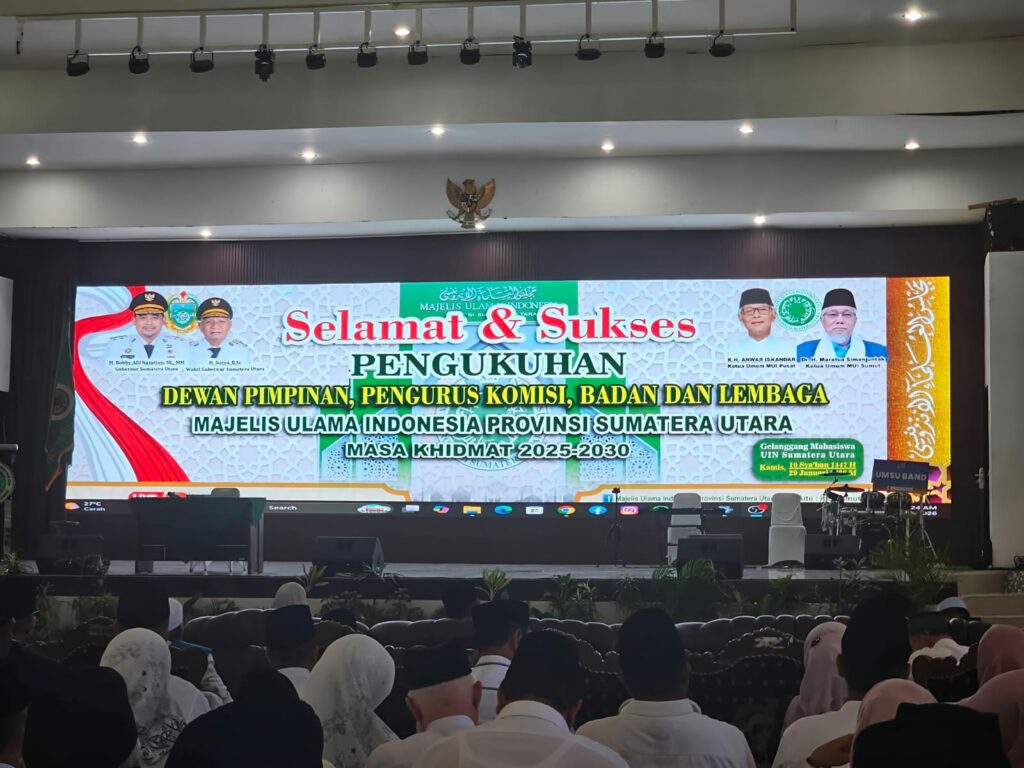 SuaraINetizen.Com – Medan, Sebanyak 513 pengurus Majelis Ulama Indonesia (MUI) Provinsi Sumatera Utara masa khidmat 2025–2030 resmi dikukuhkan dalam sebuah prosesi yang digelar di Gelanggang Mahasiswa UIN Sumatera Utara, Kamis (29/1/2026).