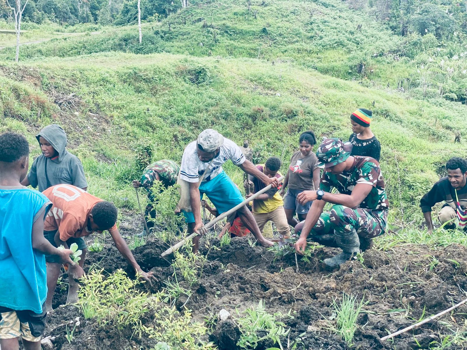 SuaraINetizen.ComKakopom, Pegunungan Bintang, Pos Parim Satgas Pamtas RI–PNG Yonif 751/Vira Jaya Sakti melaksanakan kegiatan berkebun dan makan bersama warga Kampung Kakopom, Kabupaten Pegunungan Bintang, Selasa (17/2/2026). Kegiatan ini dirangkai dengan edukasi dapur hidup sebagai upaya mendorong kemandirian pangan keluarga sekaligus mempererat kebersamaan antara TNI dan masyarakat di wilayah perbatasan.
