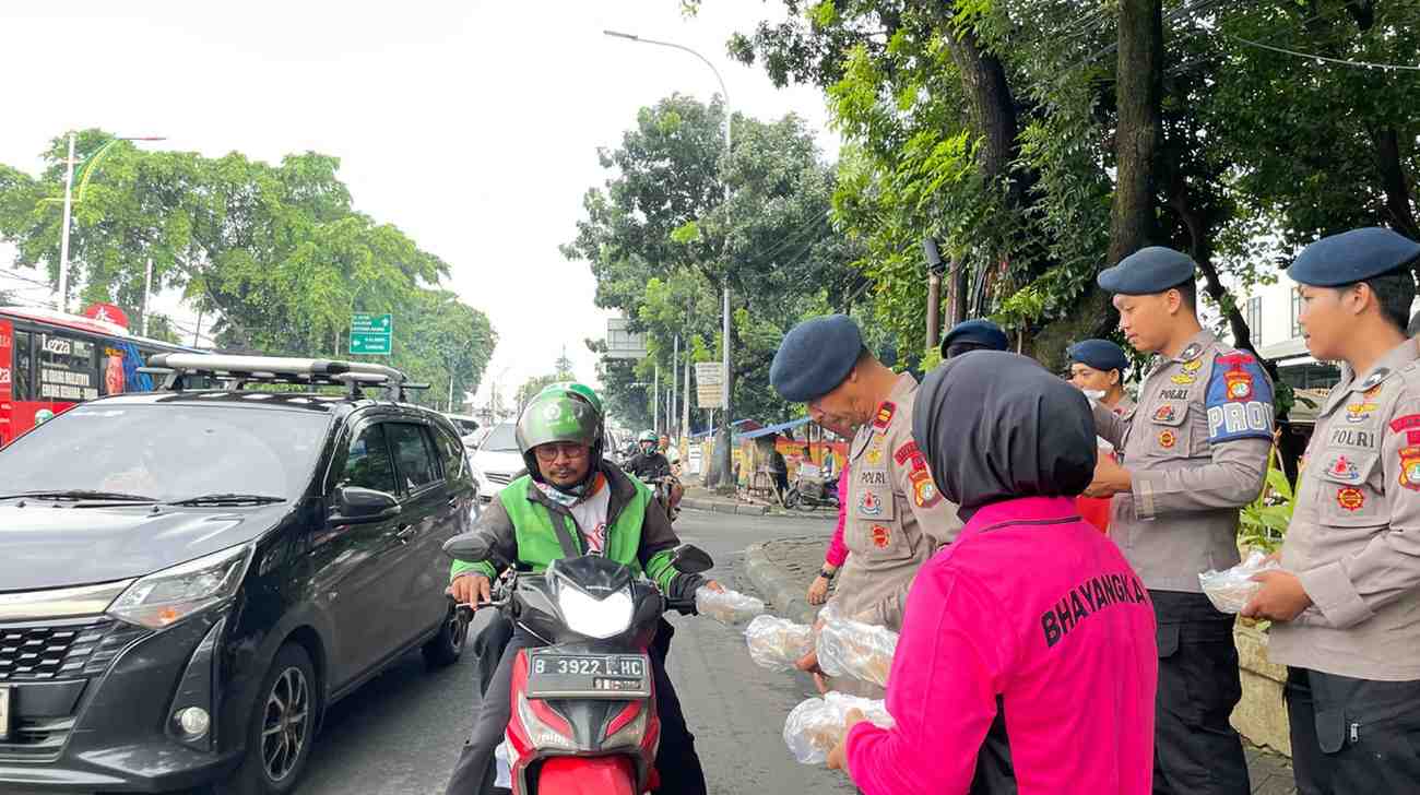 Sejak sore hari, personel Brimob dan Bhayangkari menyapa masyarakat sambil menyerahkan paket makanan berbuka kepada pengguna jalan.