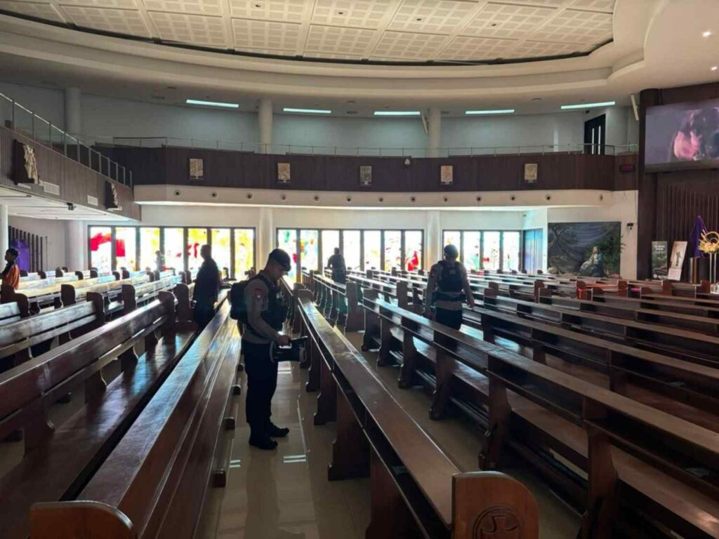 Petugas menyisir ruang ibadah utama, altar, ruang sakristi, hingga area parkir dan lingkungan sekitar gereja secara sistematis dan terukur.
